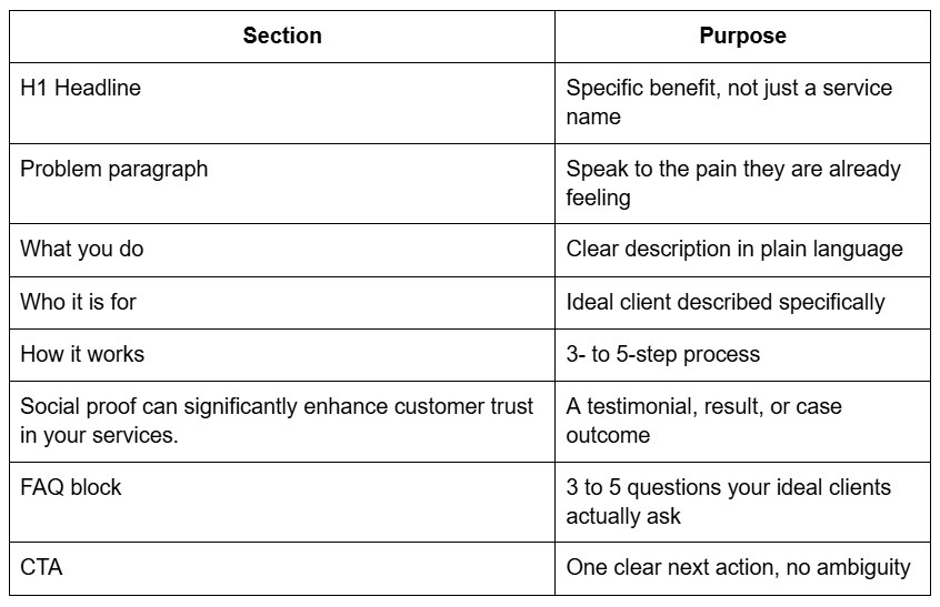 A service page that does not convert is just content taking up server space. Here is a simple framework for each of the 12 pages above: