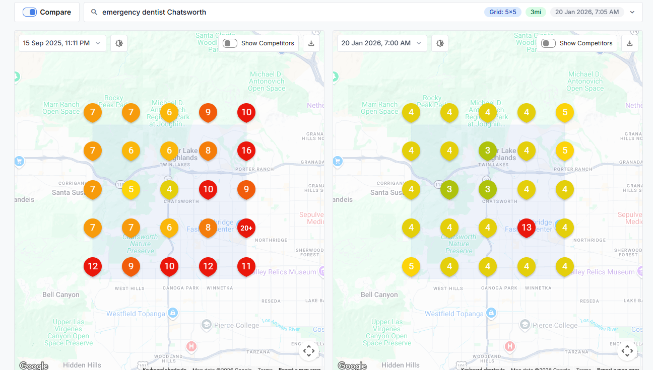 Look at the heat maps. There will be a heat map for each keyword or service. A practice may do well for "dentist near me" but not for "Invisalign near me." Heat maps show you exactly where you are visible in your service area.